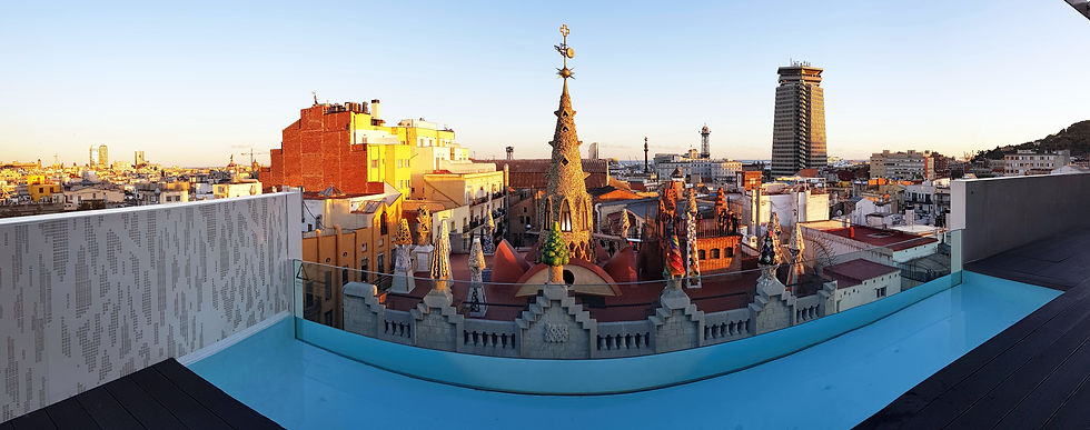 Destaca el espacio pergolado en la terraza superior con un gran jacuzzi, dispuesto longitudinalmente al Palau Güell, con el frontal de vidrio, que favorece la visual en contrapicado hacia el mismo y sus coloridas chimeneas en cubierta.